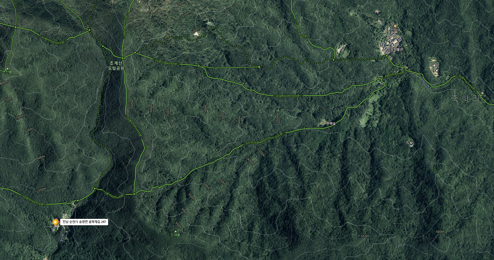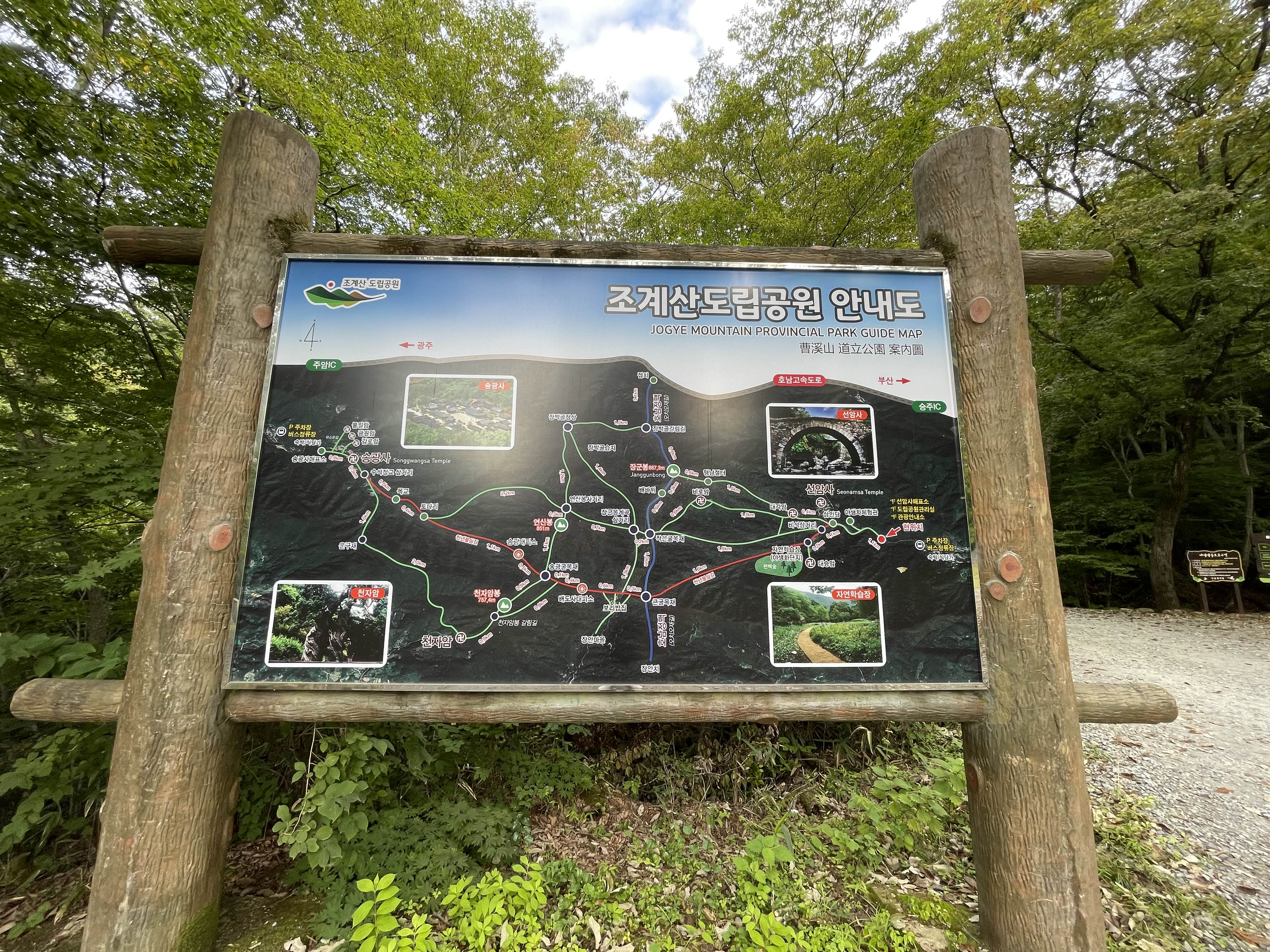 보리밥과 여러 나물을 고추장으로 쓱쓱 비벼 입에 넣고 우걱우걱 씹었더니 너무 행복했다. 앙증맞은 양으로 내어주신 반찬들도 하나같이 다 맛있어서 냠냠 음미하며 먹었다. 마실 물을 따로 내어주지 않길래 생수를 한 병 사서 마셨다. 이름하여 맑은샘 지리산! 분명 생수인데 꿀맛이었다. 가족들과 이 보리밥을 같이 먹었으면 더 좋았을텐데 이 힘든 길을 따라올 리 없겠지? 나도 당장 선암사로 돌아가는 길이 너무 힘들 것 같아서 송광사에 가서 택시든 버스든 탈까 잠시 망설이다가 큰굴목재 방향으로 발을 뗐다. 마음의 준비를 하고 처음부터 느릿느릿 걸었더니 걱정했던 것보단 쉽게 왔다. 맛있는 음식으로 배가 차니 기분이 좋아져서 그런 걸까? 도토리 떨어지는 소릴 듣고 행복해했던 나름 낭만적인 길이었다.