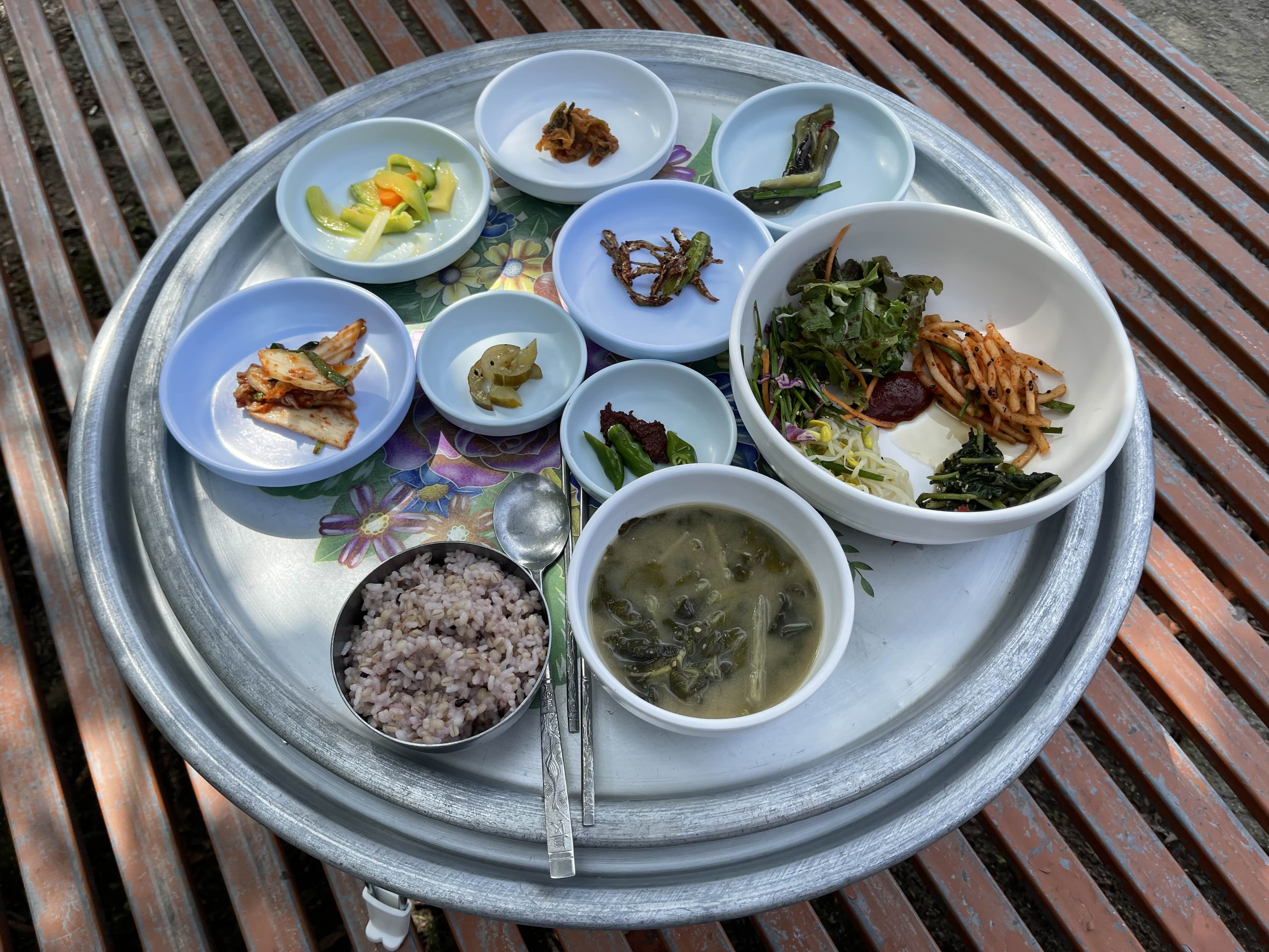 아니 그런데, 보리밥 먹기가 이렇게 힘들어서야! 보리밥집은 선암사와 송광사 사이에 있는데 천년불심길을 통해 큰굴목재까지 오르막길을 오른 후 보리밥집으로 내려가는 길이었다. 거리는 그다지 길지 않은데 길이 정말 험했다. 가는 길에 호랑이턱걸이바위라는 절벽이 나왔는데 정말 옛날에는 호랑이가 나왔을 것 같았다. 조계산은 서울 인근의 다른 산들처럼 길이 잘 정비돼있지 않고 울퉁불퉁해 발바닥이 아팠다. 벌레들까지 성가시게 달라붙어서 “밀짚모자를 챙겨가라”시던 스님 말씀을 듣지 않은 것을 후회했다. 평소 등산을 즐겨 다니는 나에게도 보리밥집 가는 길은 너무 고되었다. ‘이렇게 고생하고 먹으면 맛없기도 힘들겠다’는 생각까지 들었다. 혹시라도 그걸 노려서 이곳에 식당을 차린거라면 정말 대단한 것 같다. ㅎㅎ