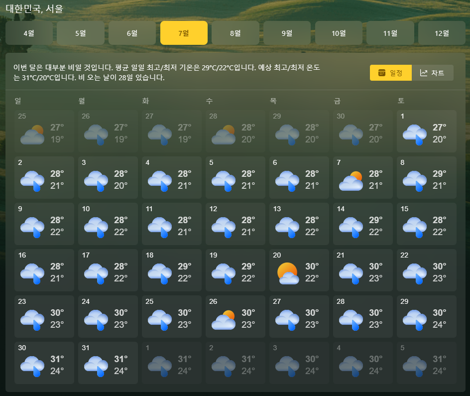 다시 MSN 날씨로 돌아와서 7월과 8월의 예상 강수확률을 보면 비가 올 것으로 예측되는 날의 강수확률은 60%로 매우 높은 편이다. 과연 이번 여름에 이렇게 비가 계속 내릴까? 직장인들은 휴가 계획에 반영해야 할 것 같고, 정부와 각 지자체에서는 안전 대책을 잘 세워주면 좋겠다. 벌써부터 축축해지는 기분이지만 비오는 날도 나름 매력이 있으니까. 비를 피할 수 없다면 즐겨봐야겠다.