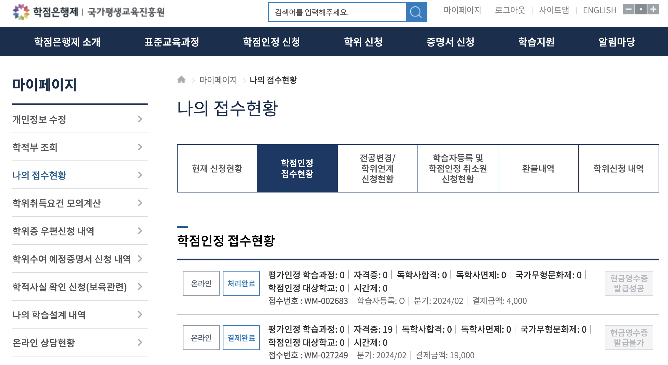 제87회 한경TESAT 시험 결과 내 성적은 1등급, 학점은행 19학점을 받게 됐다. 어차피 학점은행 수업 과목들은 모두 3학점이므로 산업기사 또는 기사 응시자격을 마련하는 과정에서 한경TESAT 2등급(18학점), 1등급(19학점), S등급(20학점) 간 의미 있는 차이는 없다. 이로써 나는 학점은행 18학점과 한경TESAT 19학점을 합해 산업기사 응시자격(36학점)을 다 채우고도 1학점이 남게 됐다. 학점인정 신청은 매년 1월, 4월, 7월, 10월에만 가능하다. 국가평생교육진흥원의 학점은행제 홈페이지에서 자격증 학점인정 신청을 하면 되는데 한경TESAT 성적표에 기재된 등록번호를 입력하면 추가 첨부파일 없이 손쉽게 신청할 수 있다. 이 과정에서 학점당 1천 원의 수수료가 발생한다.